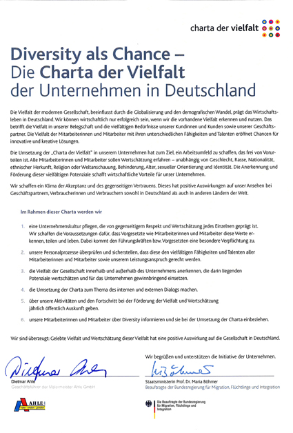 "Unternehmenspreis Vielfalt in OWL - Innovative Ansätze für Interkulturelles Personalmanagement gewürdigt Die Initiative für Beschäftigung OWL e.V hat am Mittwoch, dem 29.04.2009 den „Unternehmenspreis Vielfalt in OWL“ verliehen. Unter den ersten 23 Unternehmen, die die „Charta der Vielfalt“ eine Initiative der deutschen Wirtschaft für Integration. Verleihung und Unterzeichnung fanden vor über 100 Gästen im Rahmen der Fachtagung „Vorfahrt für Vielfalt – Potenziale von Zuwanderern im Unternehmen besser nutzen“ statt, die bei der Phoenix Contact GmbH & Co.KG in Blomberg veranstaltet wurde, war auch als einziges Handwerksunternehmen die Malermeister Ahle GmbH vertreten. Außerdem wurde die Malermeister Ahle GmbH von der Jury unter die Top 5 favorisierten Unternehmen eingestuft.