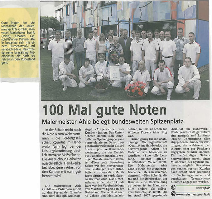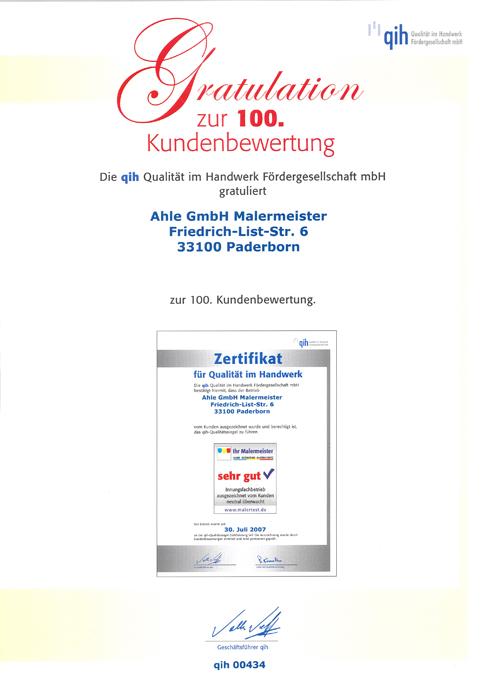 | Malerbetrieb Ahle aus Paderborn belegt bundesweiten Spitzenplatz Die Firma "Ahle GmbH Malermeister" aus Paderborn gehört zu den Besten der Branche, Grund genug für die unabhängige Fördergesellschaft „Qualität im Handwerk“, die hervorragende Arbeit des Unternehmens besonders zu würdigen. „Eine tolle Leistung“, betonte qih-Geschäftsführer Volker Kreft. Die Firma Ahle GmbH" stelle die Kundenzufriedenhaeit stets in den Vordergrund. Dies ist im Handwerk alles andere als selbstverständlich", so Kreft. Die im April 2007 gegründete „Qualität im Handwerk“-Fördergesellschaft garantiert eine neutrale und kontinuierliche Überprüfung aller abgegebenen Kunden-bewertungen, die wahlweise per Internet oder per Postkarte abgegeben werden können. Ein aufwändiges Sicherheitsverfahren macht einen Missbrauch des Systems nahezu unmöglich. Bewertungen können nur von Kunden nach Erhalt einer Rechnung mit Rechnungsnummer und zugehöriger Transaktionsnummer abgegeben werden. Das qih-Qualitätssiegel wird auch vom Hauptverband „Farbe Gestaltung Bautenschutz“ unterstützt, der Dachorganisation des Maler- und Lackiererhandwerks in Deutschland. Erst kürzlich konnte bei einer Feierstunde in der Handwerkskammer Berlin der 500. Malerbetrieb ausgezeichnet werden.