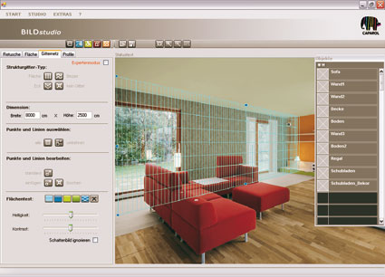 Die komplett überarbeitete Gestaltungssoftware für die fotorealistische Visualisierung von eigenen Fotos/Bibliotheksbildern bietet viele neue Möglichkeiten, ist mehrsprachig ausgerüstet und enthält mehr als 250 neue Bildmotive aus nahezu allen europäischen Ländern. Neben Farben und Strukturen umfaßt die DVD jetzt erstmals eine Vielzahl von Materialien für Böden – wie Teppich, Linoleum und Parkett – und beinhaltet Stoffe für Vorhänge sowie Innenraumprofile. Über eine Online-Materialdatenbank kann die Oberflächenauswahl mit den Kollektionen verschiedener Hersteller auf mehr als 5.000 Materialien kostenfrei erweitert werden. Der My-Material-Manager gestattet die einfache Integration der Strukturen in weitere Profi-Programme. Der 3D-Studio-Planer ermöglicht das Konstruieren und Gestalten eigener Innenräume.