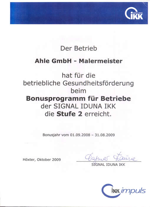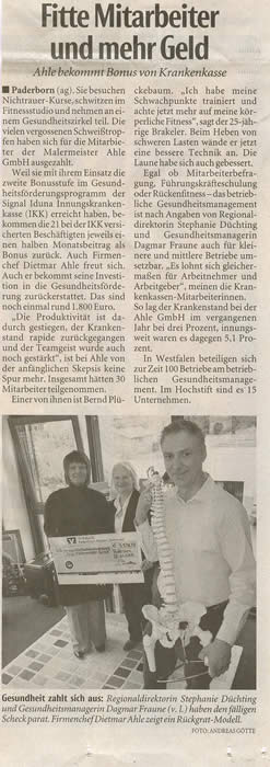 Ihre Bonuspunkte hat die Firma Ahle z.B. mit  der Durchführung einer Mitarbeiterbefragung, Einrichtung eines Gesundheitszirkels, Betriebliches Vorschlagswesen, Nichtraucherschutzreglung, Führungskräfteschulung und verschiedenen Bewegungskursen wie z.B. Rückenfitness erzielt.