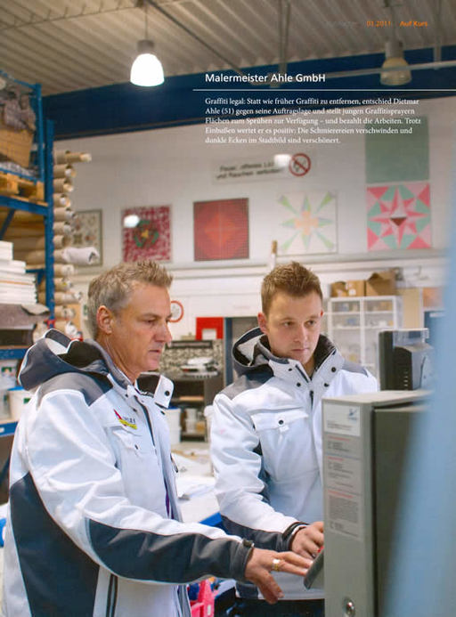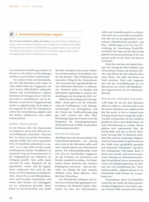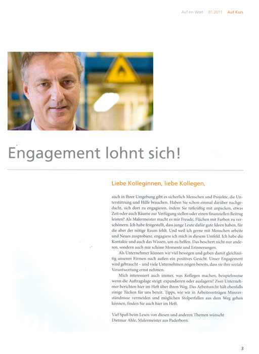 | In der aktuellen Ausgabe des Unternehmermagazin "Auf Kurs" 01.2011 berichtet Dietmar Ahle über soziale Projekte Der Malermeister Dietmar Ahle aus Paderborn rief im Jahr 2000 sein erstes Graffitiprojekt "Farbenkult - Kunst am Bau" ins Leben, um auf die Kriminalisierung der Graffiti und ihren eigentlichen Wert als Kunstform aufmerksam zu machen. Dabei wurden jungen Graffitisprayern private Wandflächen an exponierter Lage am Frimenstammsitz in der Fußgängerzone von Paderborn zur Verfügung gestellt. Dietmar Ahle wollte damit einerseits für mehr Akzeptanz für die Jugendkultur werben und die Jugendlichen andererseits aber auch für den Schutz von Privateigentum sensibilisieren. Ahle: "Durch Presse und Öffentlichkeitsarbeit und besonders Internetforen sind immer mehr Kunden und Auftraggeber auf uns aufmerksam geworden. Heute haben wir durchschnittlich etwa 20.000 Besucher monatlich auf unseren Webseiten und Internetforen wie Facebook, Twitter und Youtube." Diese Plattformen sind inzwischen Alltag für das Unternehmen. "Wir versuchen dort, tagesaktuell über unsere zahlreichen Aktivitäten zu informieren. Weiterhin laden wir Kunden und Interessierte regelmäßig zu unseren Veranstaltungen wie "Sonntags bei Ahle" ein". Dabei war der Anfang noch schwergefallen.