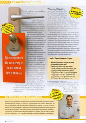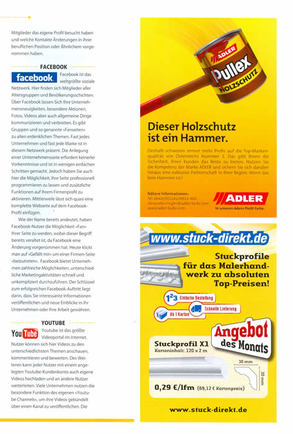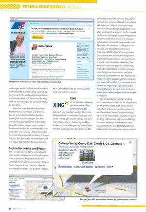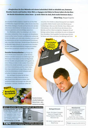 | Soziale Netzwerke, Facebook, Twitter, Blogs - fast überall ist die Rede davon. Oliver Kray erklärt in der Aktuellen Ausgabe der Malerzeitschrift "Mappe 01/2011" was sich dahinter verbirgt und wofür sich das so genannte Mitmach-Internet nutzen lässt. Das Internet ist in der heutigen Zeit aus unserem täglichen Leben kaum noch wegzudenken. Aktuelle Studien zeigen, dass rund 70% der Bevölkerung das Internet regelmäßig als Informations-, Lommunikations- und Transaktionsmedium nutzen. In den vergangenen Jahren wurde die Nutzung des Internets um eine wichtige Komponente erweitert. Diese Weiterentwicklung beschreibt man heute mit dem Begriff "Web 2.0" oder im Allgemeinen als Begriff "Social Media" für soziale Netzwerke. Heute ermöglichen diverse solziale Plattformen den Nutzern, sich mit Freunden und Kollegen zu vernetzen, zu kommunizieren und auszutuschen. Blogs, Foren und Bewertungsportlae geben jedem Internetnutzer privat oder auch geschäftlich die Gelegenheit, Inhalte selbst zu kreieren, zu bewerten und Meinungen öffentlich zu äußern. Das Internet ist interaktiv geworden, woraus Vorteile und Chancen für Sie und Ihr Malerunternehmen entstehen.