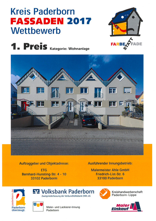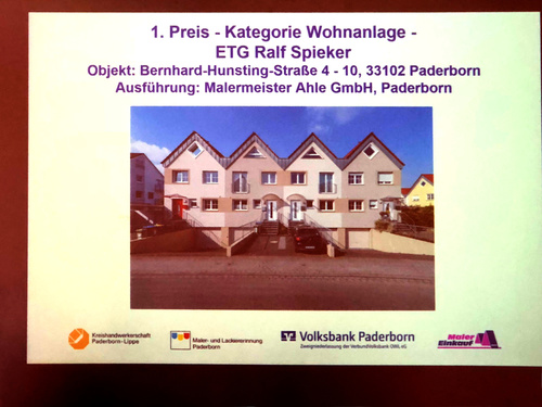 Zitat aus dem Westfälischen Volksblatt April 2018: "Aktuelle Töne, eine feine Abstimmung auf Architektur und Zweck des Gebäudes sowie die Umgebung – so lautet nach Ansicht der Jury das Erfolgsprinzig für einen Gewinn bei dem Wettbewerb, der von der Maler- und Lackiererinnung Paderborn ins Leben gerufen wurde. Erste Preise verlieh die Jury in den Kategorien Gewerbe, Historisches Gebäude, Mehrfamilienhaus, Stilfassade, Wohn- und Geschäftshaus (jeweils mit 1500 Euro Preisgeld dotiert) sowie für die von den Städten Paderborn (1000 Euro), Salzkotten und Bad Lippspringe (je 500 Euro) ausgelobten Sonderwettbewerbe.